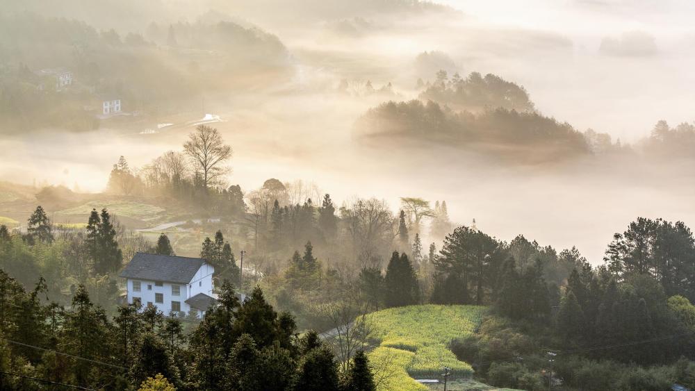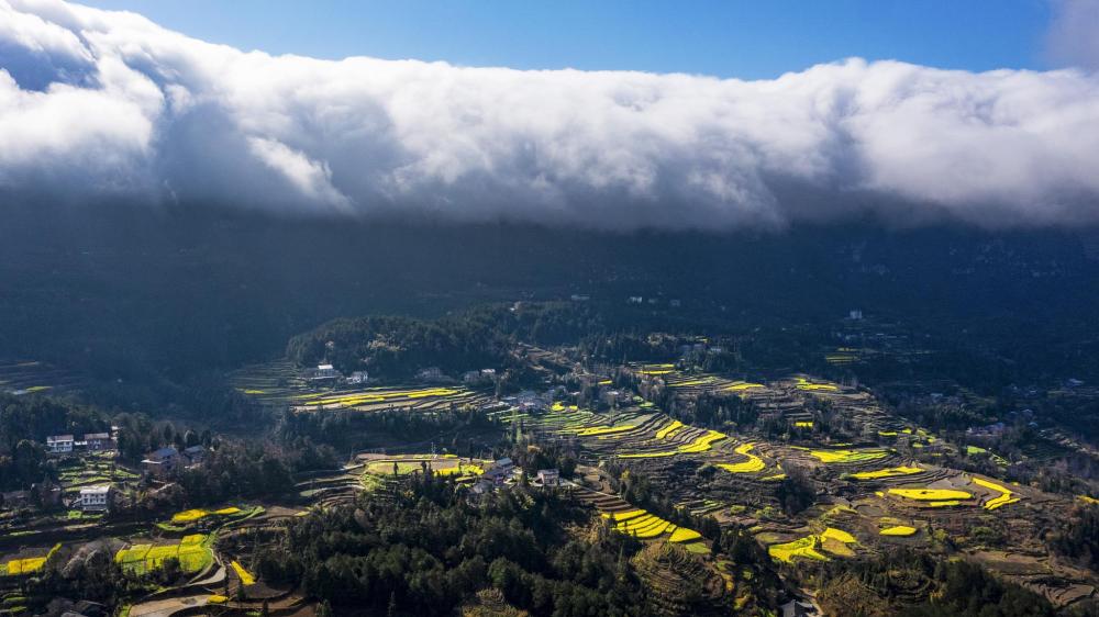 2023年3月14日,重庆,马嘴村被云雾笼罩。