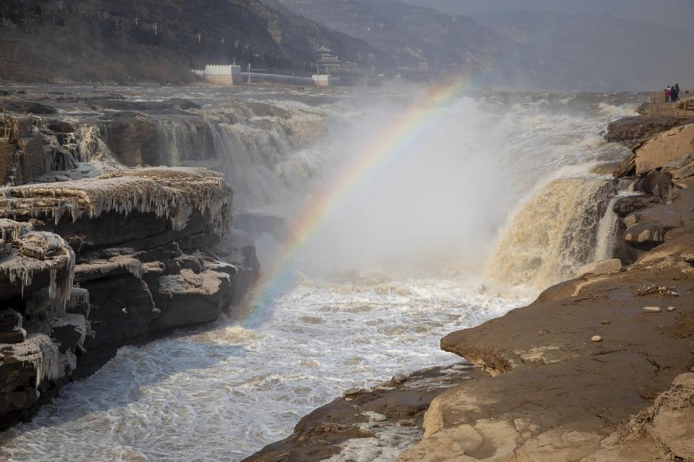 2023年1月10日,山西省临汾市,吉县壶口镇冬日的黄河壶口瀑布上空出现彩虹。