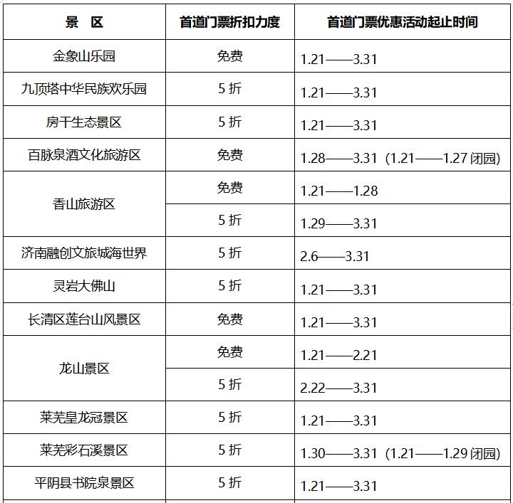 1月20日,记者获悉,济南进一步深化A级景区门票优惠活动,不仅增加了减免门票景区,还延长了减免时间。部分非国有A级景区门票减免↓