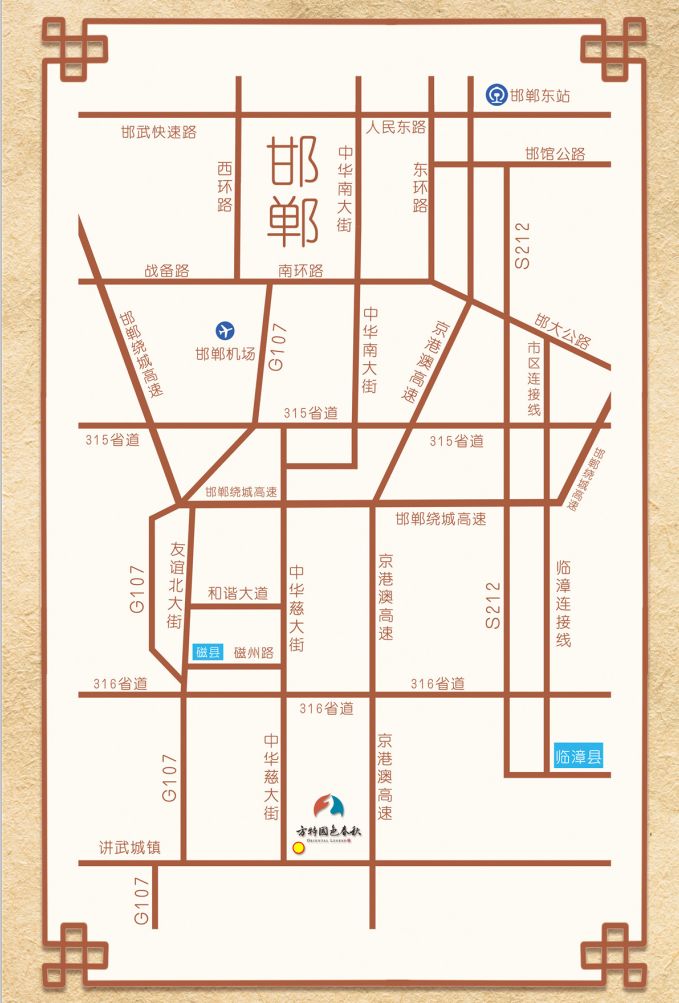经青兰高速、邯郸绕城高速、京港澳高速邺城收费站出高速右转西行500米到达邯郸方特国色春秋主题乐园