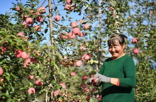 2022年10月,在陕西延安南沟村果园,习近平总书记同老乡们亲切交流,并采摘了一个红红的大苹果。