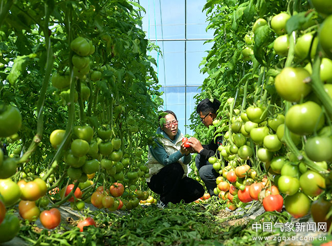 3月24日,河南省夏邑县气象局农业气象服务人员实地察看蔬果的生长状况和棚内气象条件,提出相关生产建议。图/文 苗育才