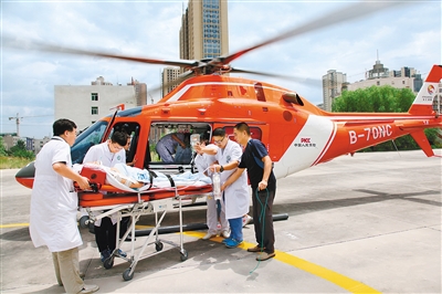 7月18日上午12时许,一架红色救援直升机稳稳地降落在唐都医院救援基地,该院医务人员安全快速护送,将从200公里外转运来的患者速送急诊科。