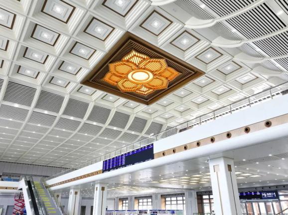 站房内部色彩以灰白色为主基调,点缀金色调,与室外金色相呼应,形成宁静朴素的禅意风格。