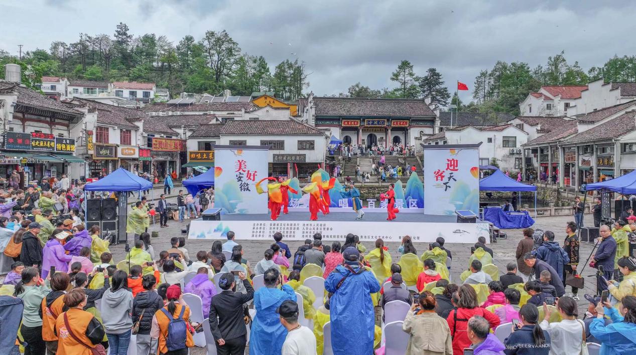 谷雨春光晓,山川黛色青。4月19日上午,“百场黄梅唱响百家景区”示范演出在池州市九华山风景区精彩上演。环布广场的历史建筑,绮丽的自然风光,曲调悠扬的黄梅戏演出,古朴又充满活力的池州傩戏、青阳腔表演,构成一幅幅生动美好的“上春山、听春曲”画卷,绽放了梦幻九华、人文九华灿烂光彩。九华山当地居民及游客3千余人观看演出。