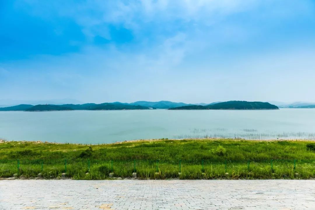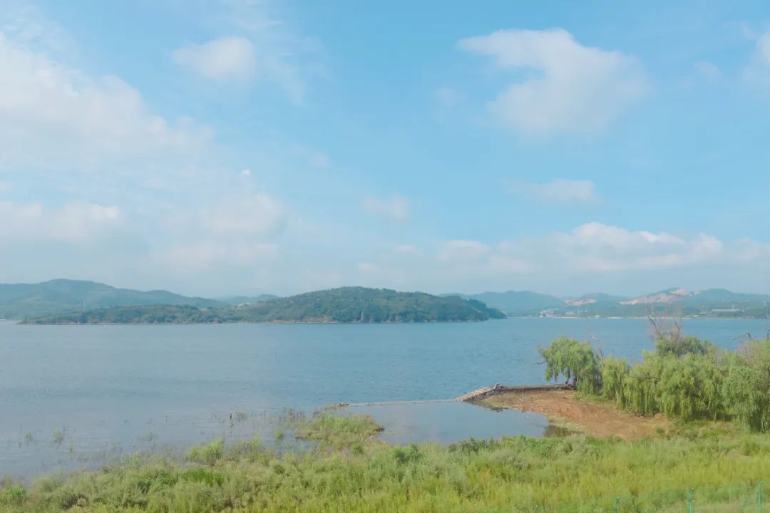 水库面积超级大,放眼望去湖面碧波万顷,水天一色,远山近岭倒映其中,鸥鸟翔空投影水面,如一幅水墨淋漓的画,清雅而蕴藉。