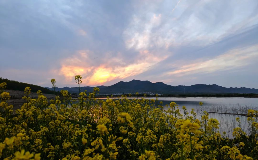 初夏的微风轻暖柔适,可以在湖边找一片空地露营,独享一汪湛蓝的湖水和连绵的群山,呼吸着清新的空气,简直太幸福啦!到了傍晚,在这里看落日晚霞也独有一番韵味。