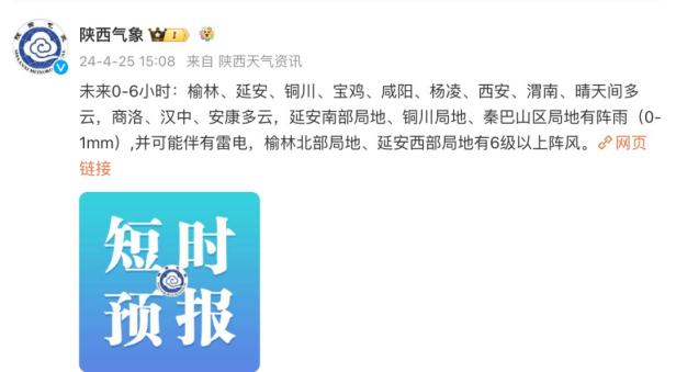 未来0-6小时:榆林、延安、铜川、宝鸡、咸阳、杨凌、西安、渭南晴天间多云,商洛、汉中、安康多云,延安南部局地、铜川局地、秦巴山区局地有阵雨(0-1mm),并可能伴有雷电,榆林北部局地、延安西部局地有6级以上阵风。