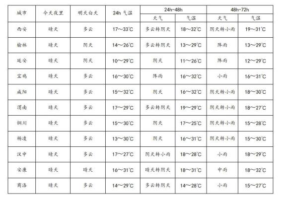 明天白天:全省晴天转多云,秦巴山区局地有分散性小雨或阵雨(0-2mm)。陕北北部有4-5级偏北风,阵风可达6级以上。