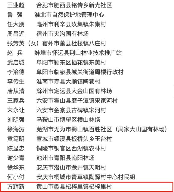 近日,省林业局公布了安徽省第四届“最美生态护林员”名单。来自全省16个市18个县(市、区)20名基层林草人被授予安徽省第四届“最美生态护林员”称号。其中,黄山市歙县杞梓里镇杞梓里村方辉新上榜。