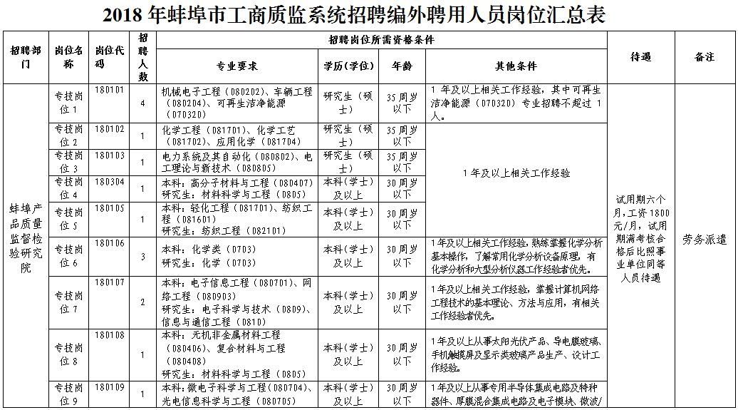 详见《2018年蚌埠市工商质监系统招聘编外聘用人员岗位汇总表》