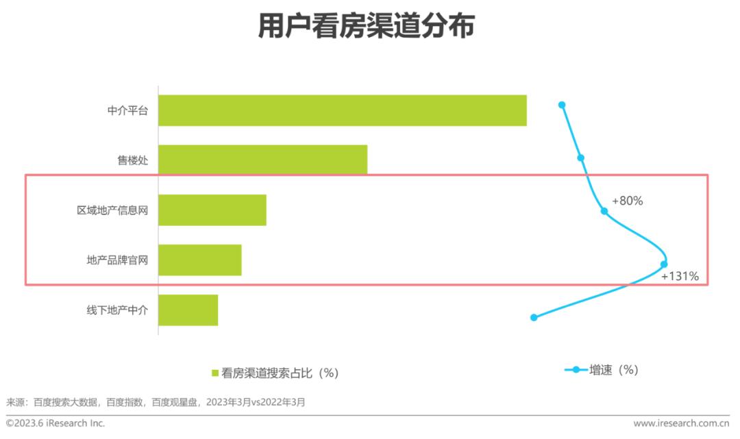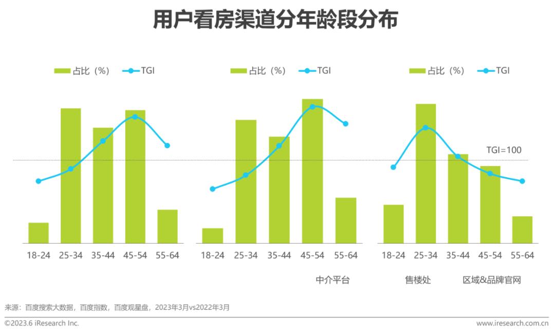 根据百度大数据,对于看房渠道的选择,年轻人更偏好地产品牌官网、区域地产信息网等官方渠道;45岁及以上用户更注重品牌口碑,偏好通过中介平台了解对比,且有更多空闲时间前往售楼处实地看房。