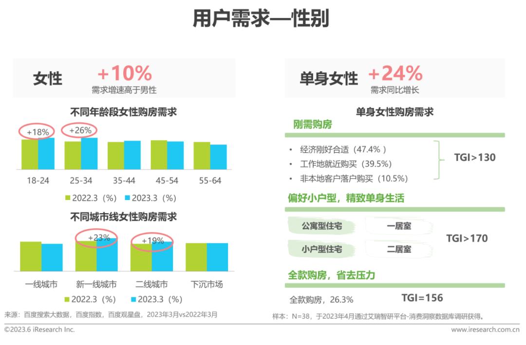 随着女性意识的觉醒及单身人群的增加,年轻女性购房需求加快释放。从百度大数据上看,2023年3月,女性需求增速较快,其中,18-34岁年龄段,新一线、二线城市的女性购房需求释放尤为显著。此外,单身女性购房需求3月同比提升24%,从调研数据上看,单身女性因刚需购房特征明显,偏好小户型,适合一人居住的一居室或二居室,在经济宽裕情况下,更偏好全款购房。