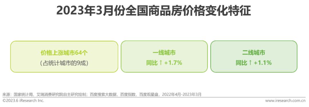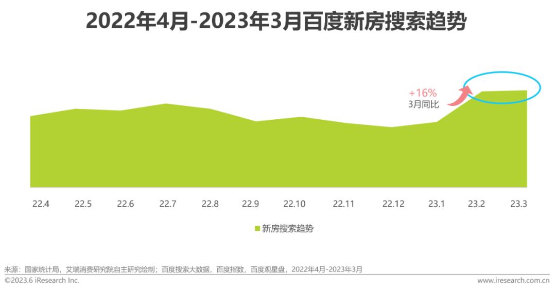 国家统计局数据显示,1-3月份商品住宅销售面积同比增长1.4%,销售额同比增长7.1%。3月份商品住宅销售价格环比普遍上涨,其中,一线城市新建商品住宅销售价格环比上涨0.3%,同比上涨1.7%;二线城市新建商品住宅价格环比分别上涨0.6%,同比上涨1.1% ,涨幅呈现扩大之势。从百度相关搜索数据上看,2023年初新房需求开始复苏,3月份搜索数据同比增长16%。