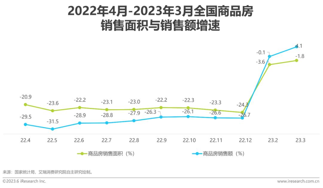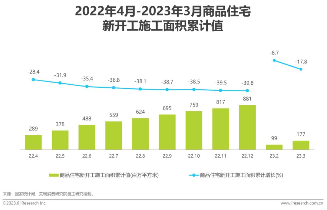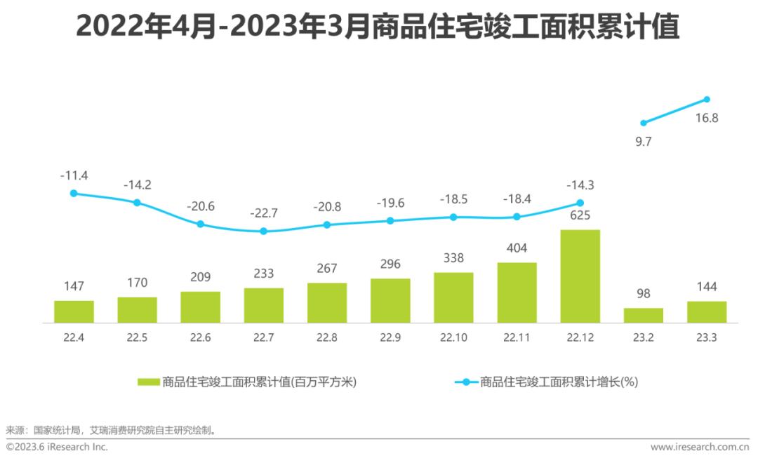 从数据上看,随着国家政策和供需关系的共同作用,2023年第一季度商品住宅新开工施工面积累计增长-17.8%,同时商品住宅竣工面积累计值增长达16.8%,保证更多住宅顺利交付。早期房地产过度开发、新开工施工面积远超于竣工面积的行业发展问题也将逐步得到改善。