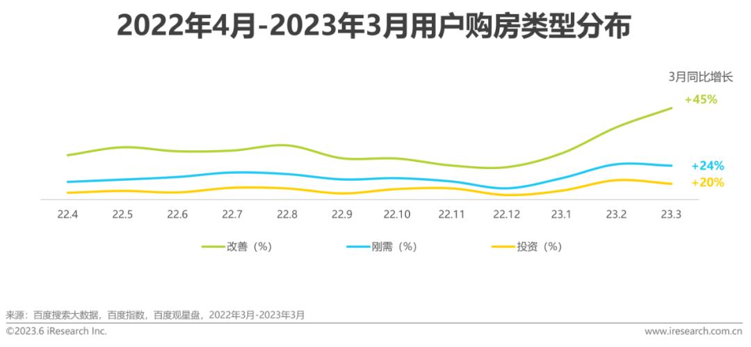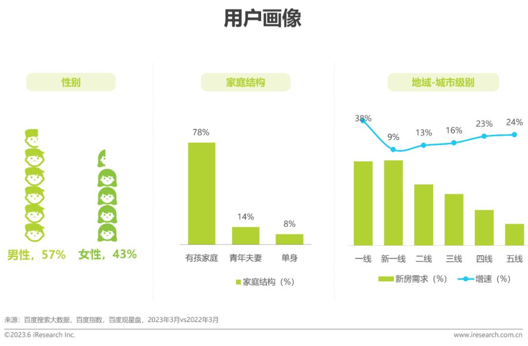 根据调研数据,已婚有孩用户占比近八成,是购房选房的主要用户群体。从百度大数据来看,男女用户需求较为均衡,从城市线来看,需求向头部城市集中,一线城市用户购房需求高,且需求增速快,2023年同比增速达38%。