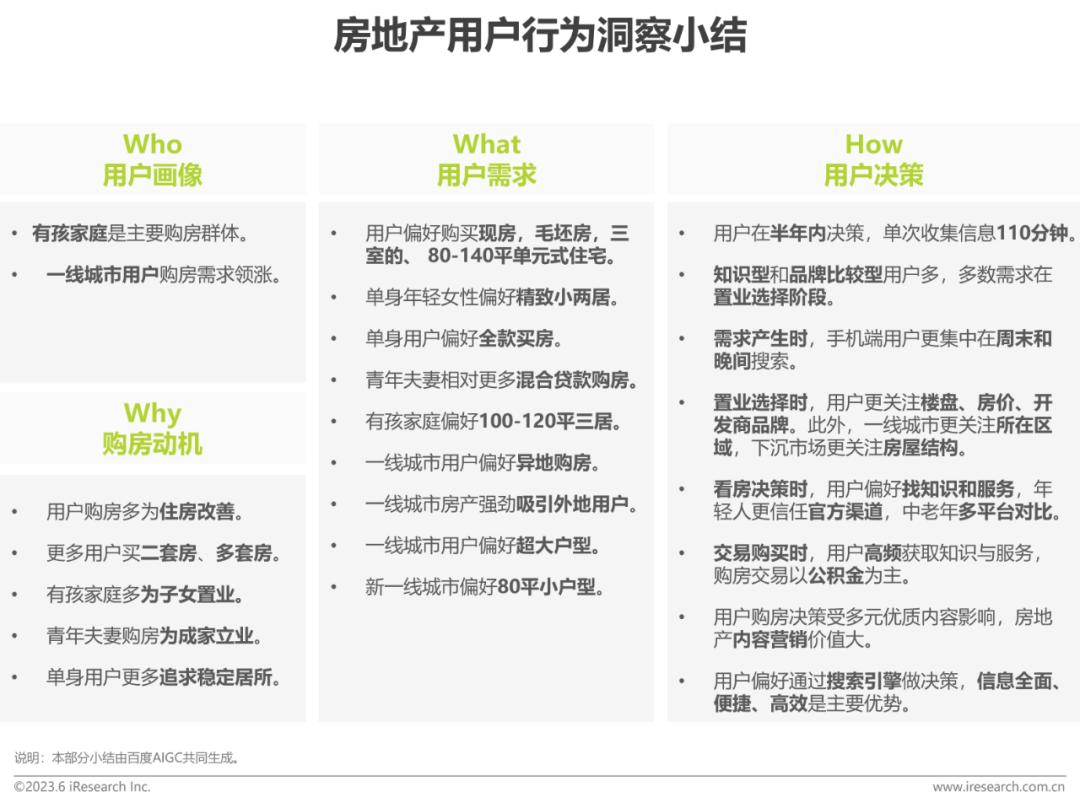 用户洞察:用户画像上,有孩家庭是主要购房群体,一线城市用户购房需求领涨。购房动机上,改善性购房提升,更多用户购买二套、多套房。用户需求上,多数用户偏好购买80-140平住宅、三室、现房住宅;单身女性偏好全款购房,一线城市用户偏好异地购房。用户决策上,大多用户在半年内决策,单次收集信息110分钟,多数需求在置业选择阶段。用户决策受优质内容影响,房产内容营销价值大。用户偏好通过搜索引擎决策,信息全、便捷、高效是主要优势。