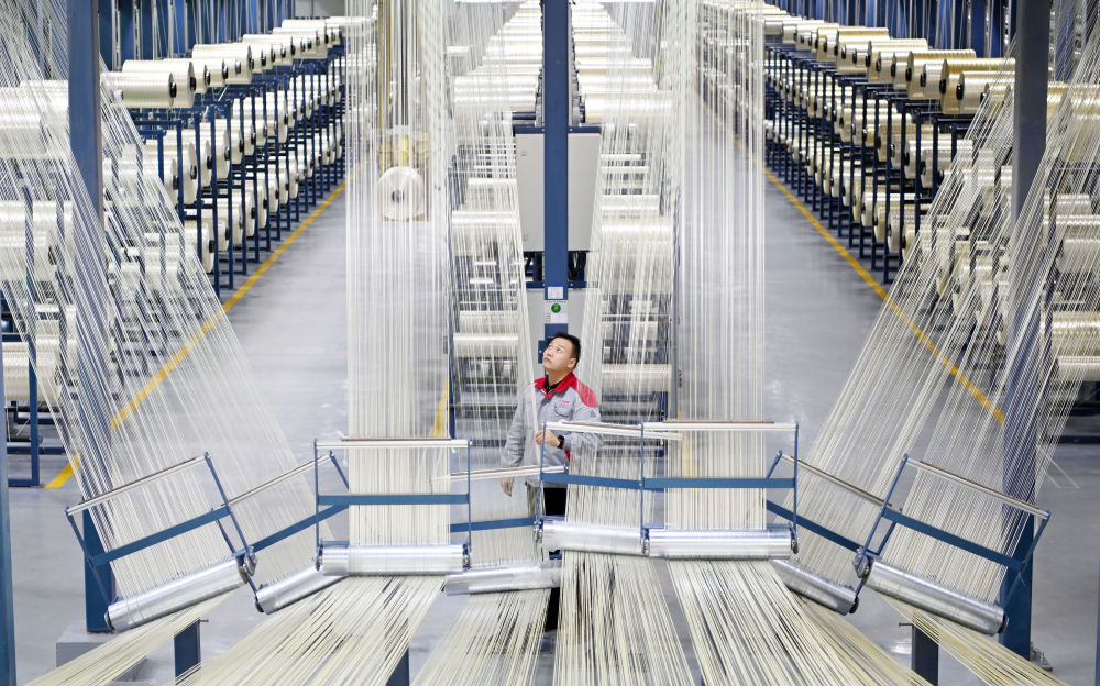 在中国建材集团西宁万吨碳纤维生产基地,工作人员整理碳纤维原丝 王鹏 / 摄