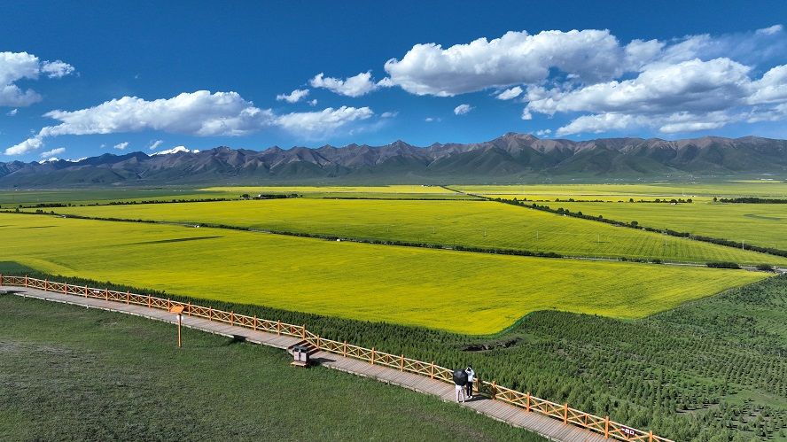 夏日,在位于祁连山腹地的青海省海北藏族自治州门源回族自治县境内,油菜花竞相绽放,花海、雪山、草原共同组成色彩斑斓的祁连山夏日画卷 韩方方 / 摄