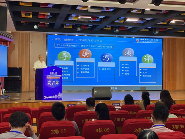 随后,德阳市华山路学校校长、德阳市东林路小学校校长陈兵与德阳市旌阳区教育科学研究与教育培训中心主任李成分别就美育主题发表了专题讲座。陈兵校长在其讲座《育人有“戏”——教育戏剧融入语文课堂之教学实践》中,详细介绍了华山路学校在戏剧实践教学、校本戏剧课程开发以及戏剧教育平台建设方面的经验和成果。李成主任则全面分享了旌阳区近年来在美育规划和建设上所取得的进展。他们的讲座内容丰富、观点新颖,为与会者提供了宝贵的学术思考和实践经验。