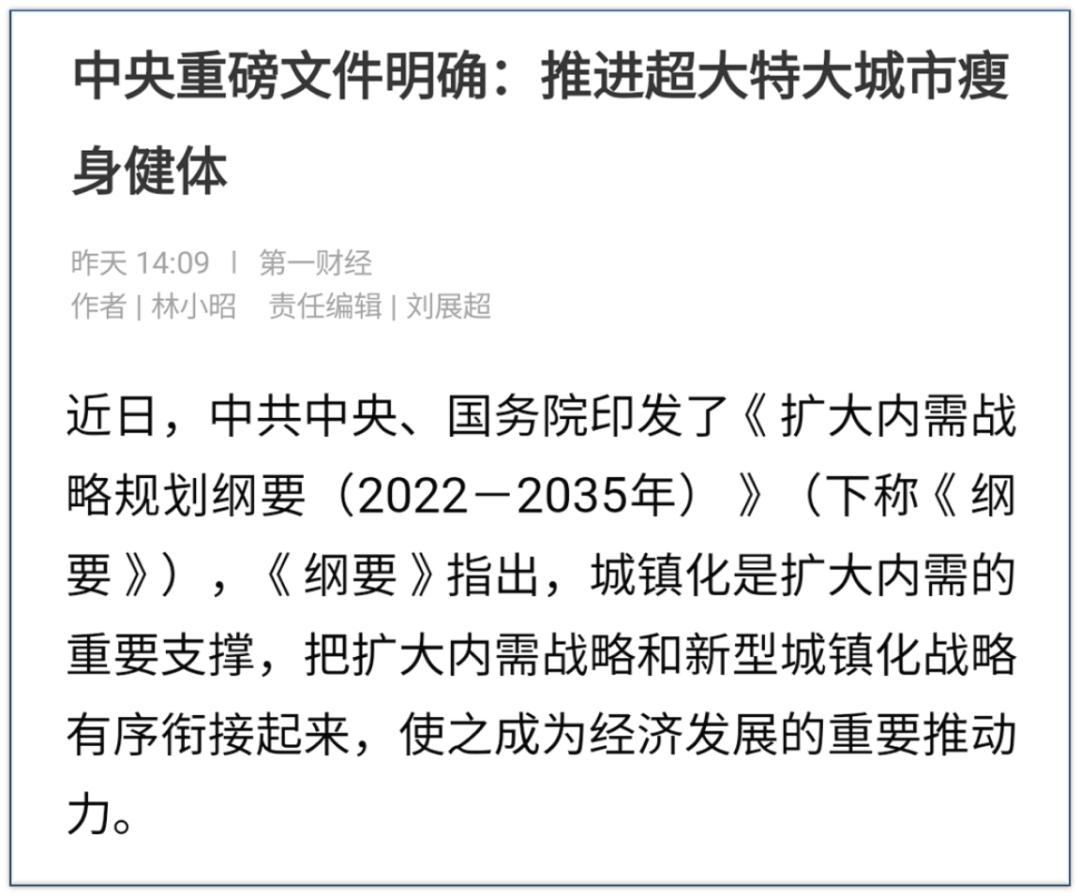 中央日前印发的《扩大内需战略规划纲要(2022-2035年)》提出,推进超大特大城市瘦身健体,严控中心城市规模无序扩张……合理确定城市规模、人口密度、空间结构。