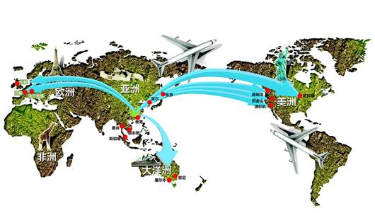 图为:纵横密布四省国际及地区直达航线