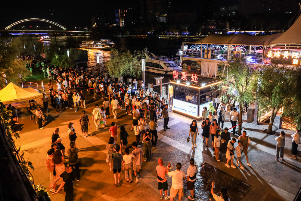 7月27日,游客在黄河兰州段白塔山码头排队乘船。新华每日电讯记者 马希平 摄