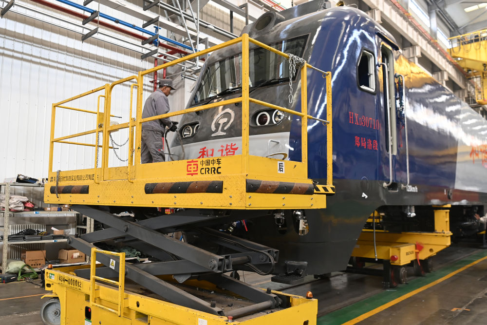 在位于兰州市安宁区的中车兰州机车有限公司,工作人员在机车检修线上作业(11月13日 摄)。新华每日电讯记者 范培? 摄