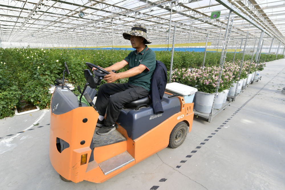 在兰州新区现代农业示范园花卉产业基地,工人使用转运车转运采摘的玫瑰(8月1日 摄)。新华每日电讯记者 范培? 摄