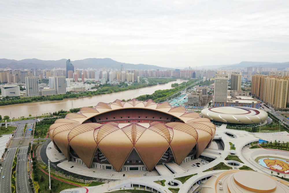 这是在兰州市七里河区拍摄黄河沿岸的兰州奥体中心(无人机照片)。新华每日电讯记者 范培? 摄