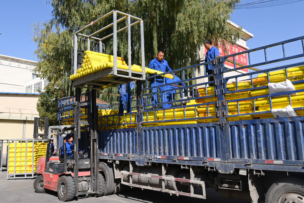 在兰州市榆中县一家塑料制品有限公司,工人往货车上装运地膜(10月28日 摄)。新华每日电讯记者 范培? 摄