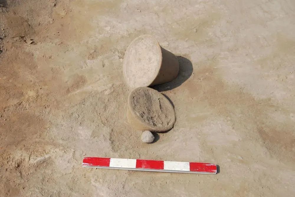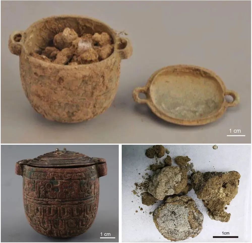 这是在刘家洼遗址一座中型贵族墓藏考古出土的青铜小罐和其中的残留物