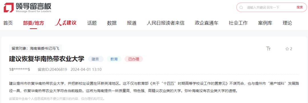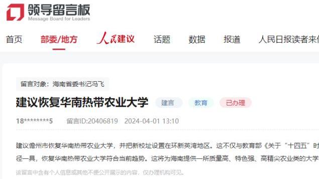 近日,有网友于人民网领导留言板建议“恢复华南热带农业大学”,弥补海南没有农业类大学的遗憾。对此,海南省教育厅回复称,原华南热带农业大学于2007年8月并入海南大学,在当前的形势下,很难再回到从前的办学体制,恢复华南热带农业大学也未纳入高校设置规划。