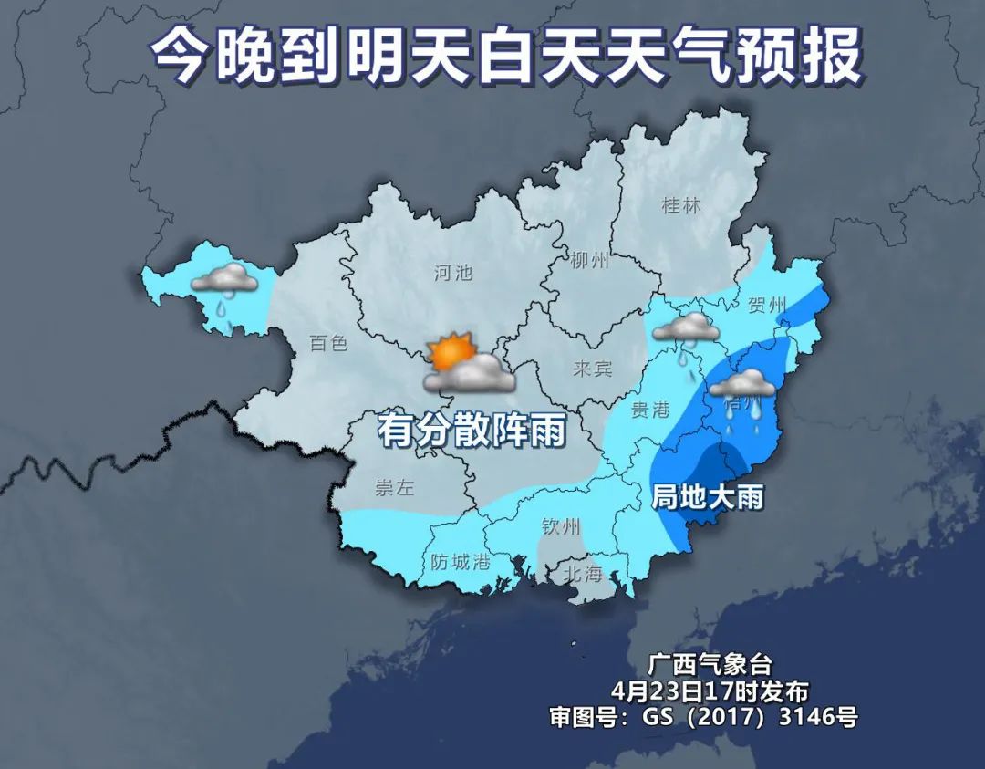 今天晚上到明天白天,玉林、梧州、贺州三市有小到中雨、局地大雨,其它地区多云有分散阵雨。