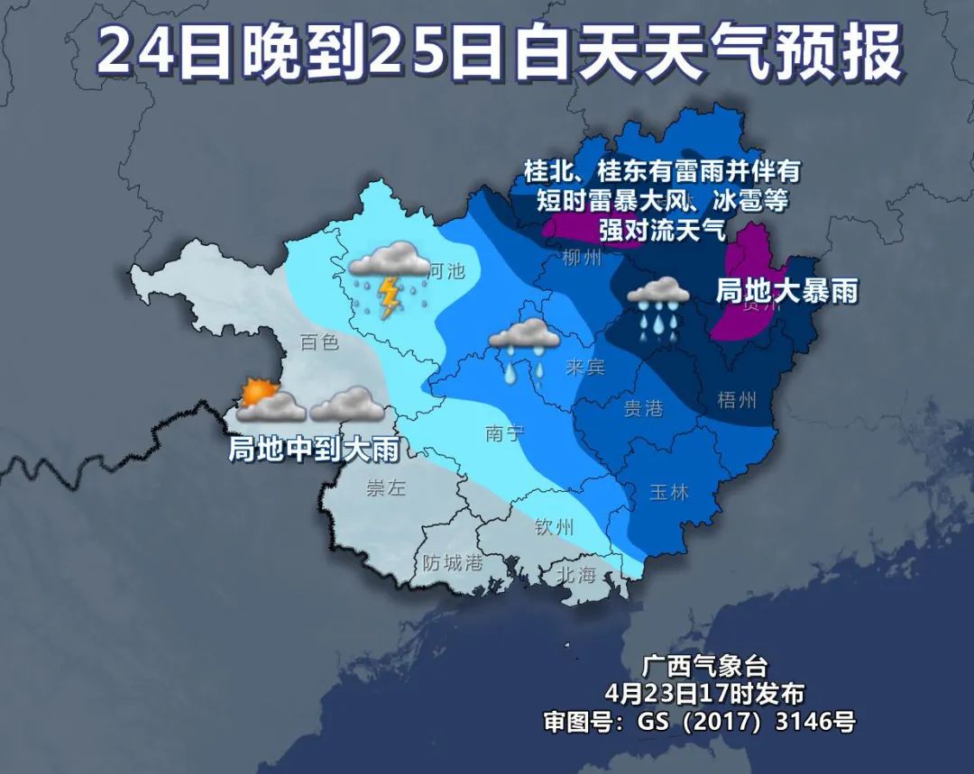 24日晚上到25日白天,桂东有大雨到暴雨、局地大暴雨,桂西多云到阴天有阵雨或雷雨、局地中到大雨。桂北、桂东有雷雨并伴有短时雷暴大风、冰雹等强对流天气。