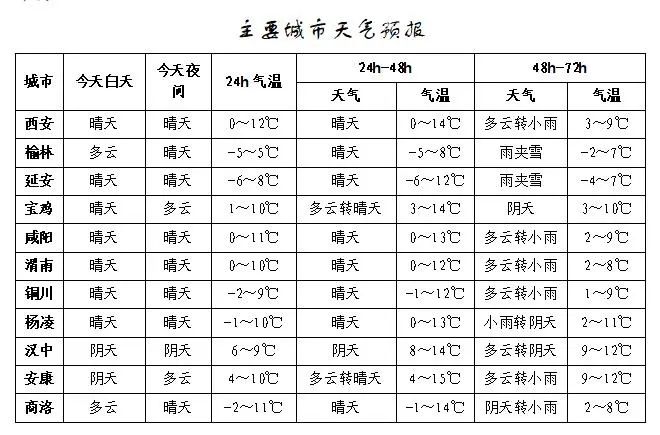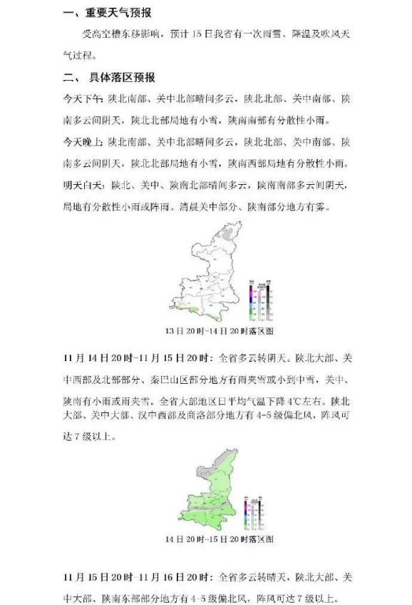 15日:全省多云转阴天。陕北北部、关中西部及北部部分、秦巴山区部分地方有雨夹雪或小到中雪,陕北南部部分、关中部分、陕南大部有小雨或雨夹雪。全省大部地区日平均气温下降4℃左右。陕北大部、关中大部、陕南东部有4-5级偏北风,阵风可达6级以上。