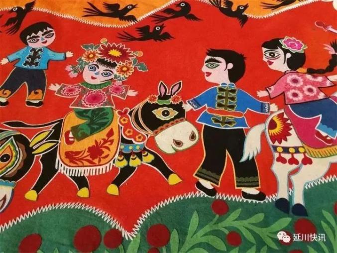 延川布堆画源自于当地心灵手巧的婆姨们在补衣时将一些图案缝制补丁处,通过层层堆摞、厚厚缝衲,将补丁制成漂亮的装饰物。不仅美化生活,耐磨耐穿,更能以此传达自己对美好生活的追求。