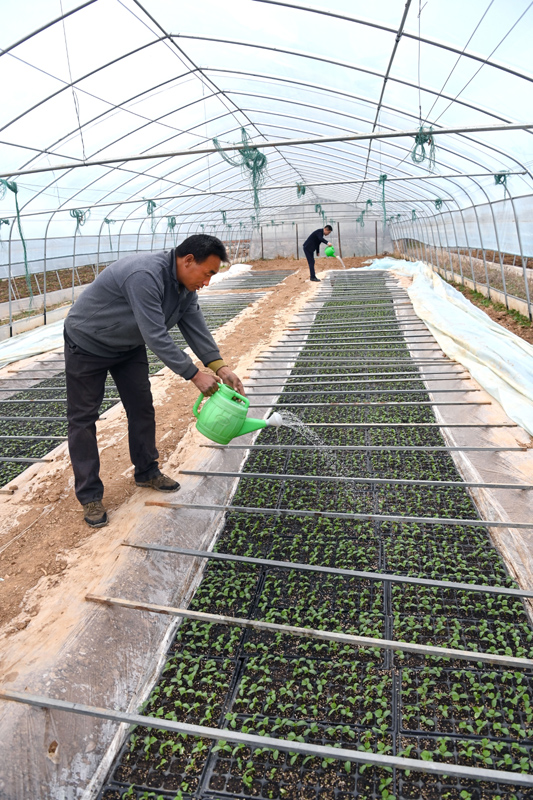 3月15日,麻坪镇三兴村的村民在大棚里为培育的菜苗浇水。该镇引进投资,发展大棚120亩。