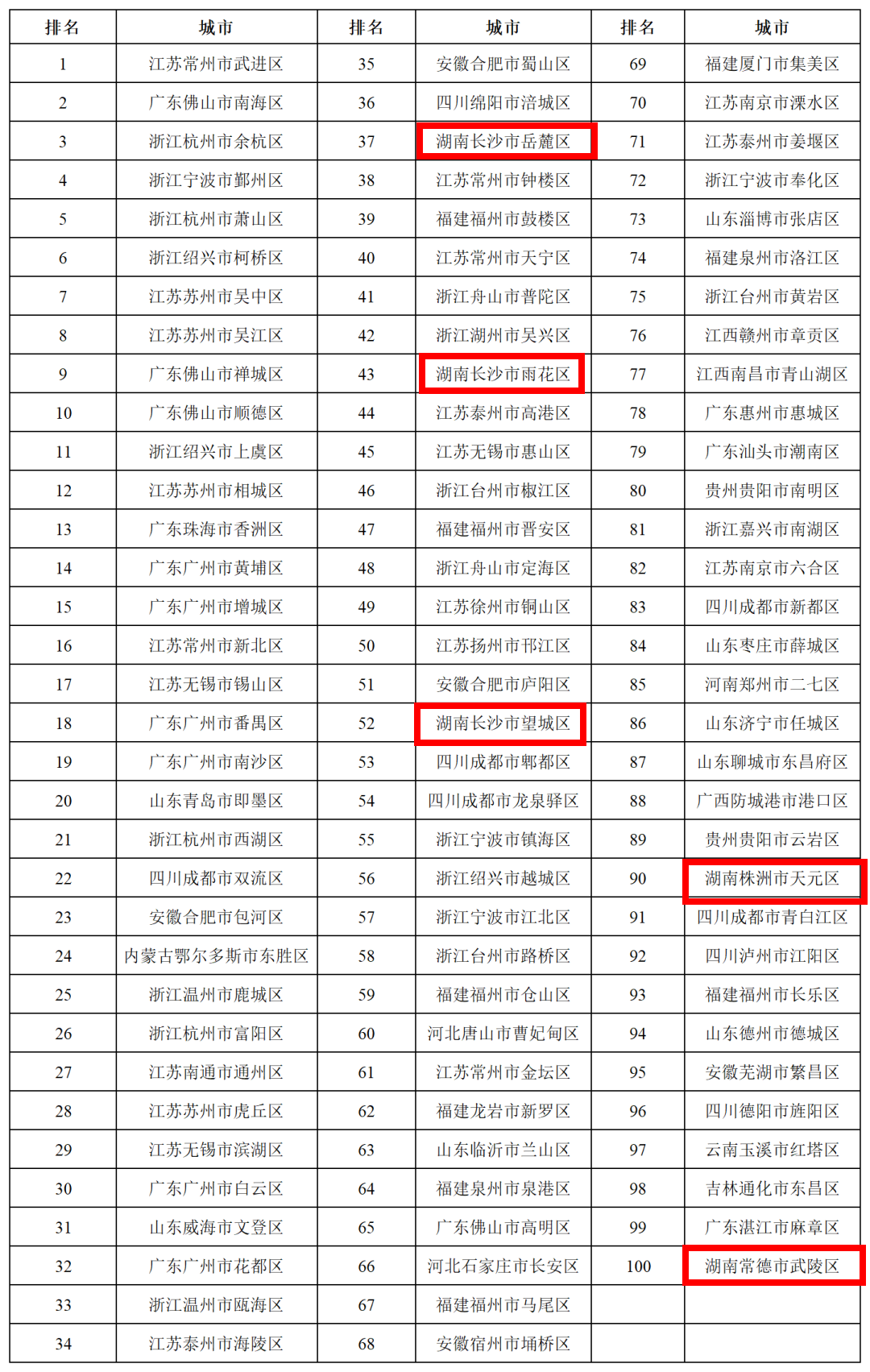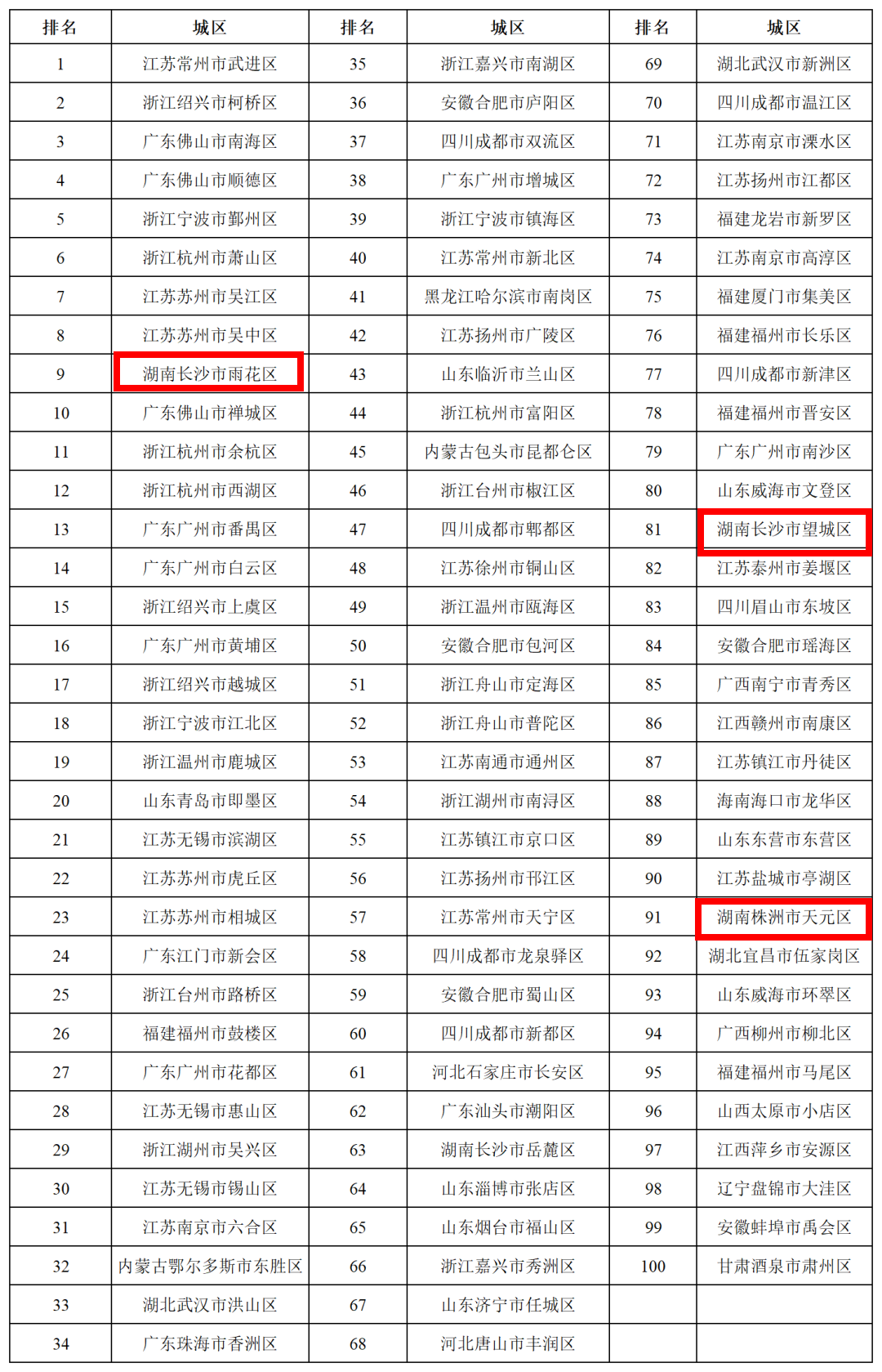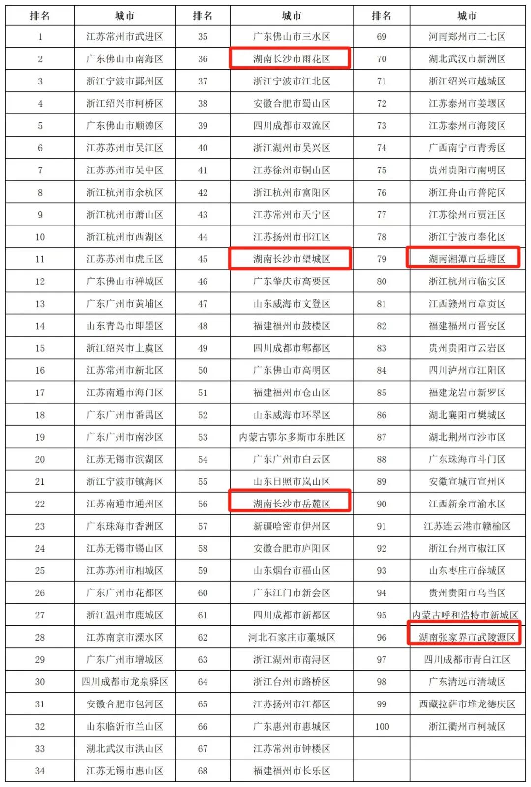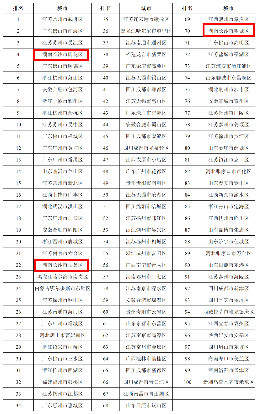 长沙市雨花区、岳麓区和望城区等3区上榜全国综合实力百强区。