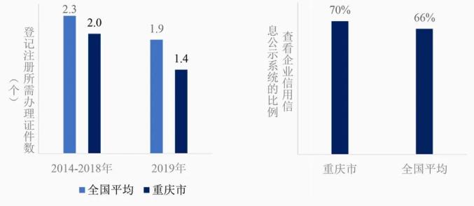 从省内市场主体反馈看,重庆在“减证”改革和信用监管普及度方面的表现,都高于全国平均水平。如图5所示,重庆市2019年登记注册所需办理证件数为1.4个,比2014-2018平均所需减少0.6个,进步幅度大于全国平均水平。重庆市70%的市场主体会查看企业信用信息公示系统,高于全国平均水平四个百分点。