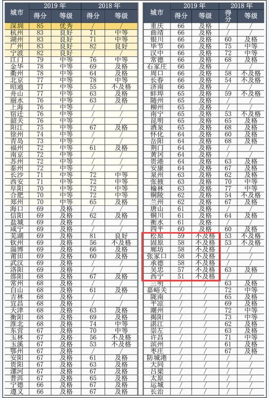评级划分标准为:优秀(85-100分)、良好(81-84分)、中等(71-80分)、及格(61-70分)、D级(60分以下)。三明、嘉峪关、陇南、平凉、潮州、揭阳、湛江、崇左、许昌、滨州、枣庄、防城港、大同、吕梁、太原、运城、长治2019年有效样本量不足30个,2019年得分空缺。2019年新增的调研城市,其2018年得分空缺。