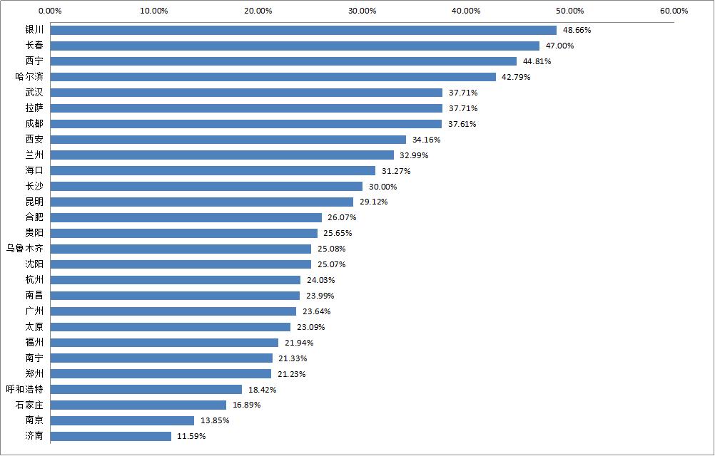 不仅中西部经济较发达的四川成都、湖北武汉、陕西西安、河南郑州、安徽合肥首位度均高于东部沿海省份,经济较不发达的宁夏银川、云南昆明、西藏拉萨首位度也居于前列位置。说明首位度高低并不能衡量一个城市的经济发展水平或者评判城镇化结构是否合理。