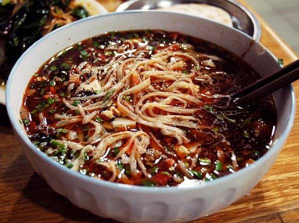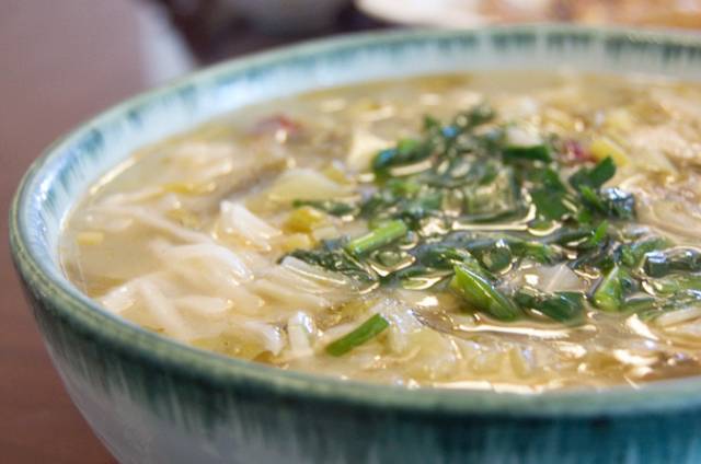 “敦煌八大怪”之三。浆水为芹菜或箭杆白菜、莲花菜投入面汤,加上浆水酵子,盛入缸内放在温暖处发酵三天而得。