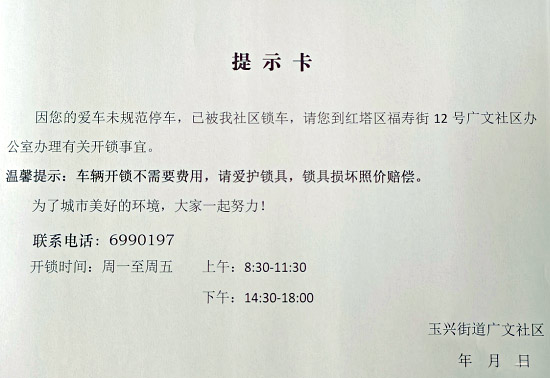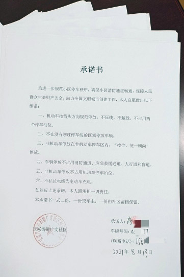 “以前,遇到小区里有电动车、摩托车乱停放,我们的工作人员在管理中经常找不到车主,只能把车抬到停车区域。对于挪不动的,工作人员会把车锁了,但被锁的车主发现车被锁后,要么和管理人员发生冲突,要么直接把锁撬了。”广文社区居委会副主任梁潇说,为了以柔性手段劝导居民,也让管理方法更加触及人心,今年5月,广文社区开始对辖区内不按规定停放的车辆开具“道德罚单”,罚单上提示了社区办理开锁事宜的电话和时间。但开锁的前提是,被锁车主必须到社区签订一份“保证书”交由社区留档保存。