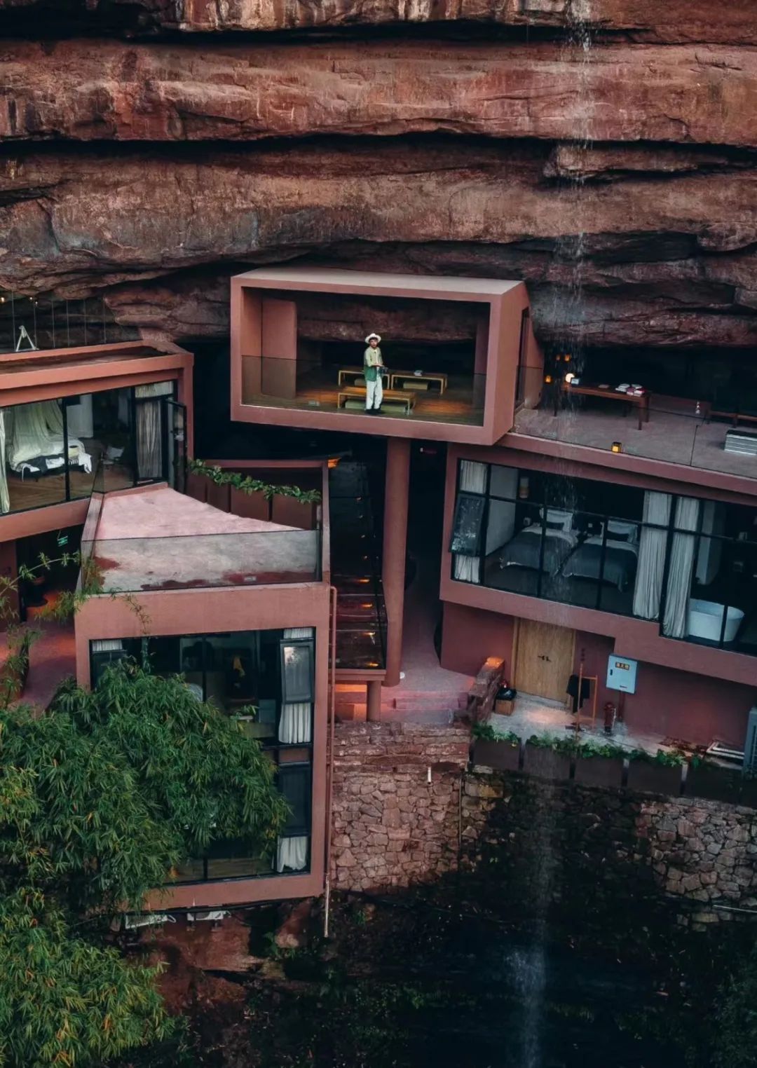 这里是国内首个纯天然洞穴民宿,悬崖,洞穴,瀑布,竹林环绕着酒店,把建筑与自然完美结合,将野奢发挥到了极致,在贵州的诸多民宿中,“匠庐·雅路古”可能是最亮眼的存在。2022年一开业,它就拿到了当年的“雪鹿奖“和“黑松露奖”等多个民宿界认可的大奖。