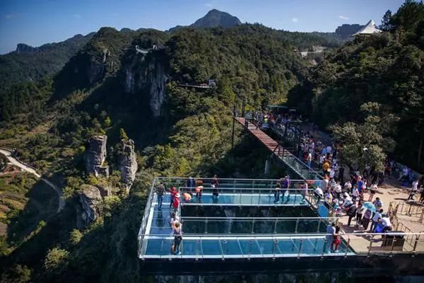 进入高空项目区,首先引入眼帘的就是天空悬廊,一个巨大的“A”字型玻璃廊桥高耸的伫立在那里,桥上人来人往,悬挑支出长度将近70米,被吉尼斯世界纪录认证为“世界最长的玻璃廊桥”。