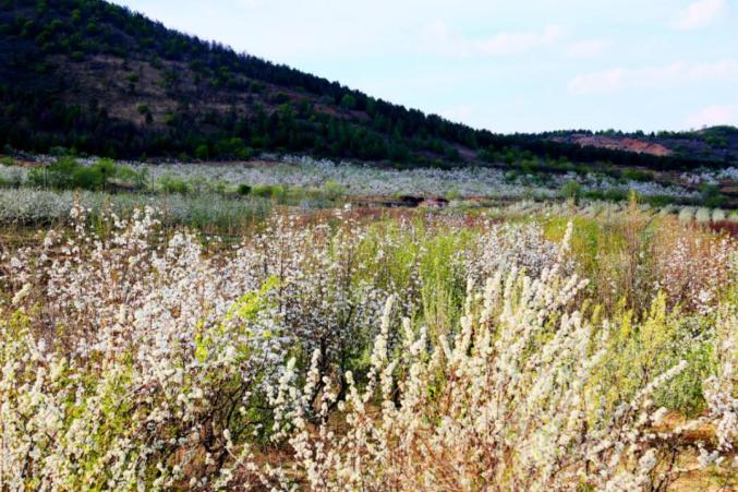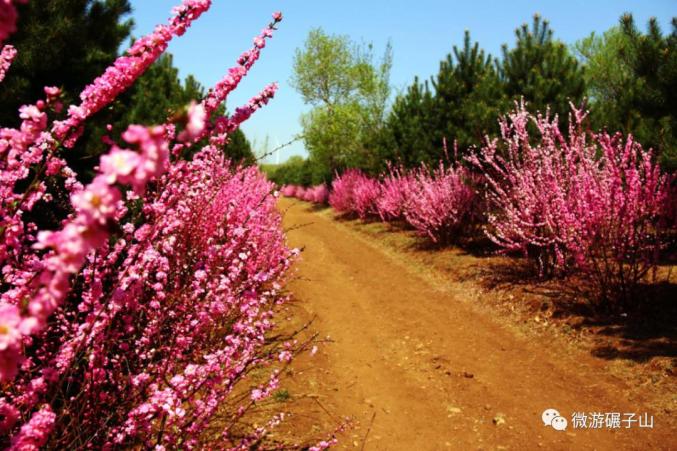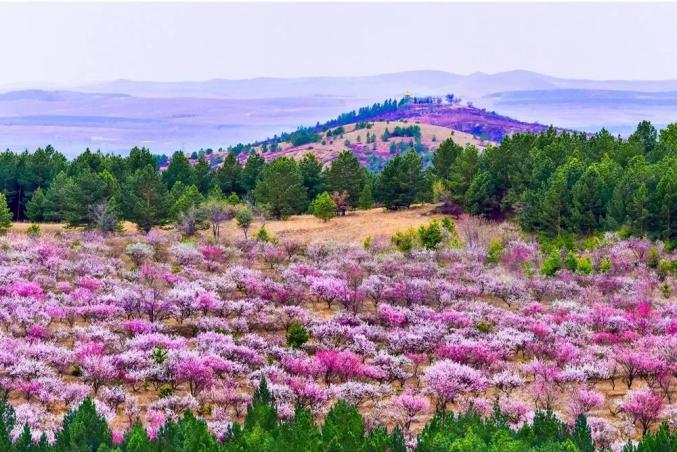 碾子山的“桃红开了,满园里姹紫嫣红,远远望去,似乎天上落下一大片朝霞。