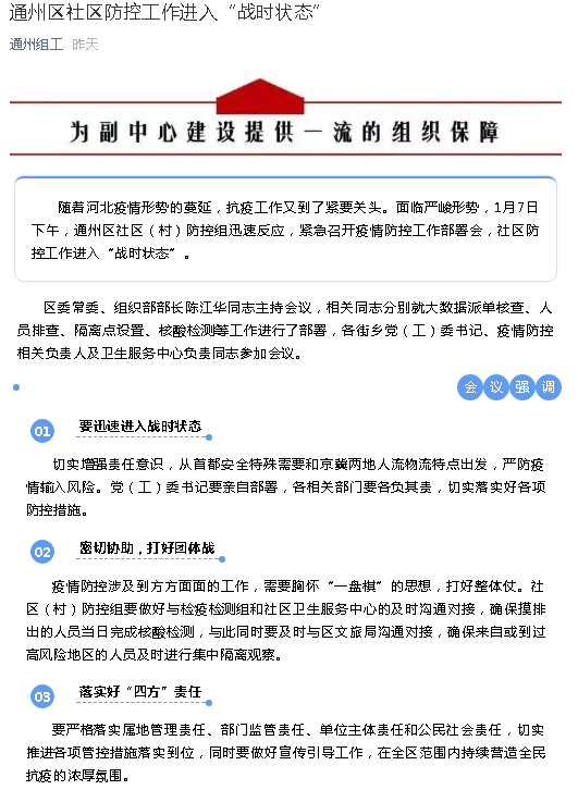 另据北京市通州区委员会组织部官方微信公众号“通州组工”消息,随着河北疫情形势的蔓延,抗疫工作又到了紧要关头。面临严峻形势,1月7日下午,通州区社区(村)防控组迅速反应,紧急召开疫情防控工作部署会,社区防控工作进入“战时状态”。