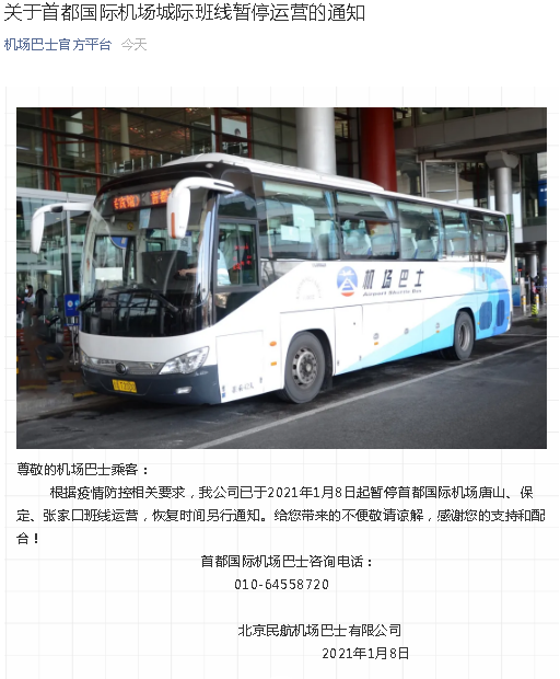 交通运输方面,据北京民航机场巴士有限公司消息,根据疫情防控相关要求,公司已于2021年1月8日起暂停大兴机场天津线、保定线、廊坊线、唐山线、沧州线、张家口线、固安城市航站楼班线、固安客运班线(固安南站)运营,恢复时间另行通知。同时,2021年1月8日起暂停首都国际机场唐山、保定、张家口班线运营,恢复时间另行通知。