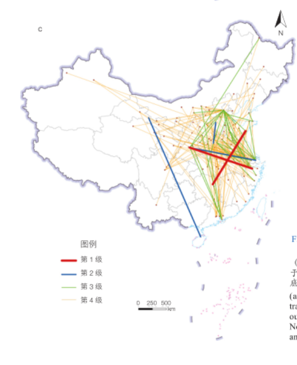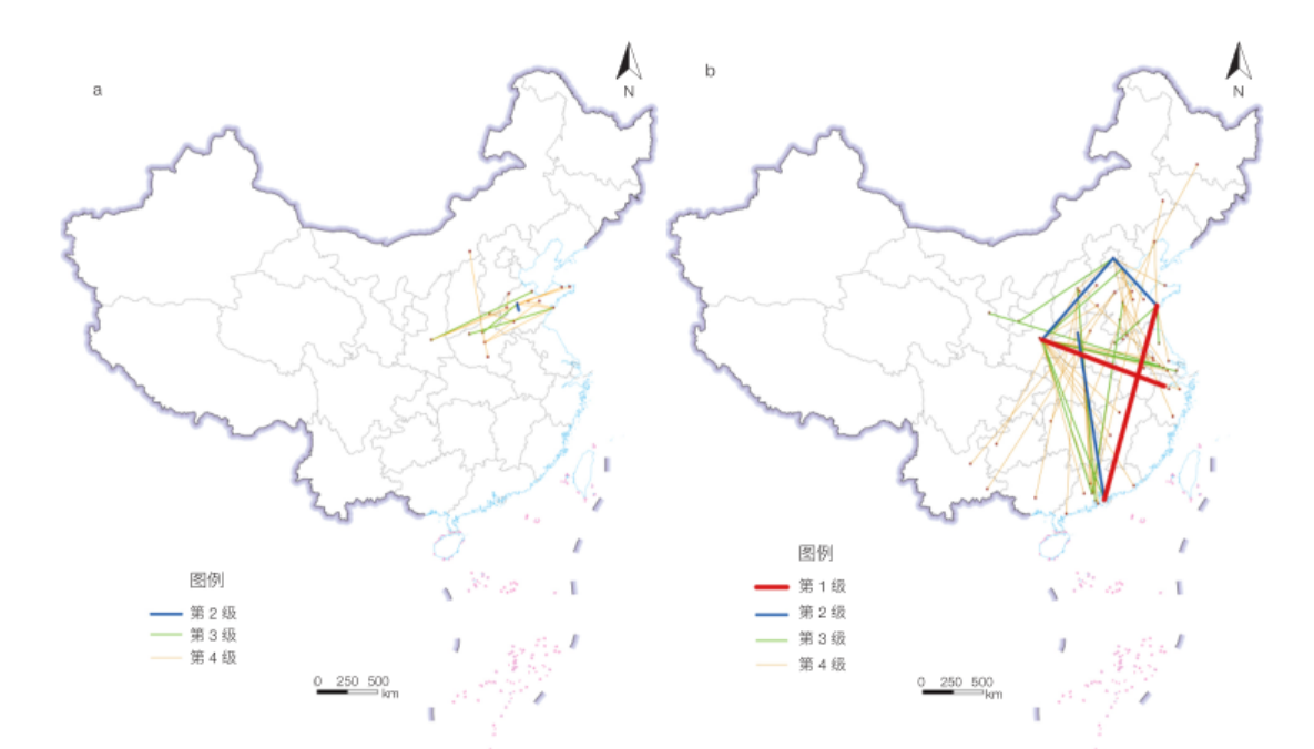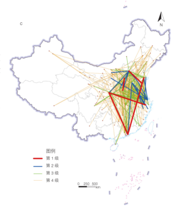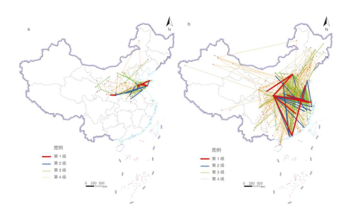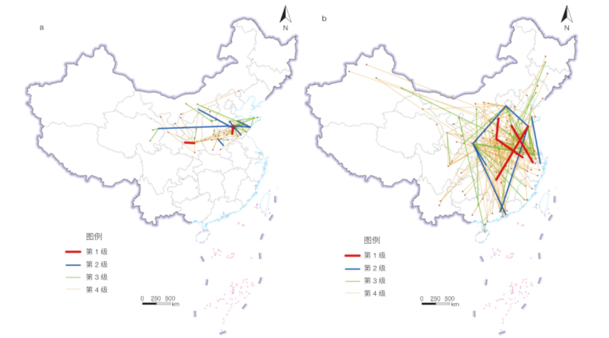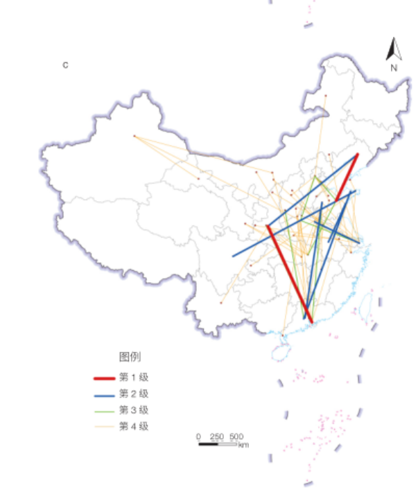 城市间技术转移次数的计算通过C语言编程实现,技术转移网络的空间可视化则基于ArcGIS的Python编程实现。综合分析发现,技术转移次数存在较大差异,为突出城市间技术转移的层级特征,文章将技术转移次数分为4类。具体分类方法为:将技术转移次数从小到大排序,其均值为A1,大于A1的技术转移次数的均值为A2,大于A2的技术转移次数的均值为A3,则[A3, +∞)、[A2, A3)、[A1, A2)、[0, A1)的技术转移次数分别记为第1级、第2级、第3级、第4级。